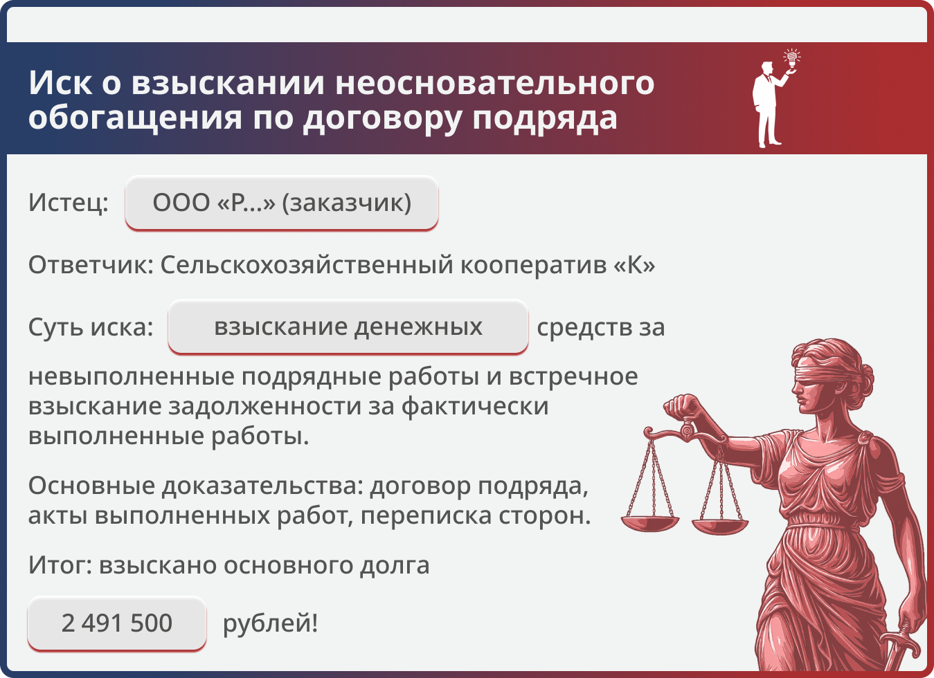Данный пример показывает эффективность активной позиции ответчика: своевременная подача встречного иска позволяет не только отклонить необоснованные требования, но и взыскать причитающиеся подрядчику суммы. Дело иллюстрирует важность надлежащего документального оформления выполненных работ и грамотного расчёта договорных санкций, что в совокупности даёт возможность защитить интересы добросовестного подрядчика даже в ситуации, когда заказчик инициирует судебный спор.