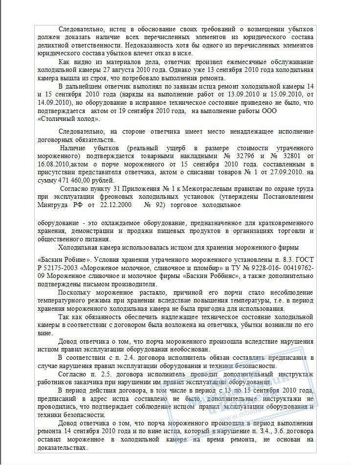 - Причинно-следственная связь. Из-за неисправности холодильной камеры температура хранения не соответствовала норме, в результате чего мороженое растаяло. Это подтверждено актом о порче от 15 сентября 2010 года, составленным в присутствии мастера ответчика, и актом о списании товара от 27 сентября 2010 года.