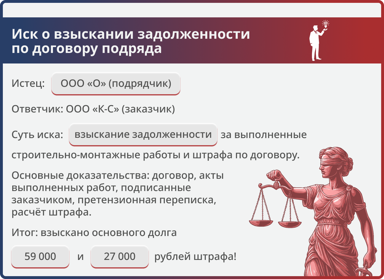 Заказчик отказался полностью оплатить строительно-монтажные работы, ссылаясь на качество. Юрист доказал в суде, что работы приняты без замечаний. Суд взыскал не только основной долг, но и штраф в пользу подрядчика.
