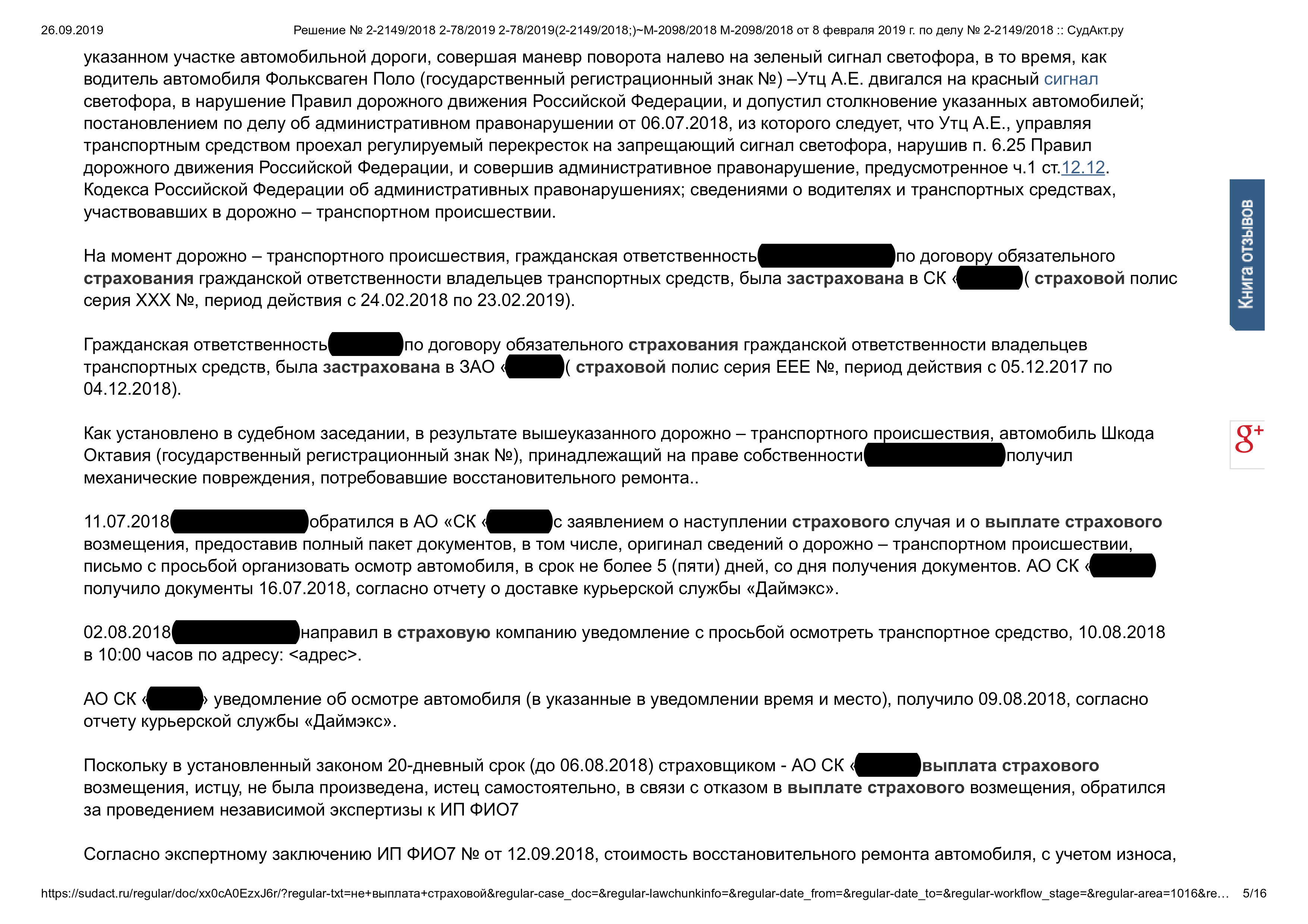 • Дело о взыскании страхового возмещения после ДТП