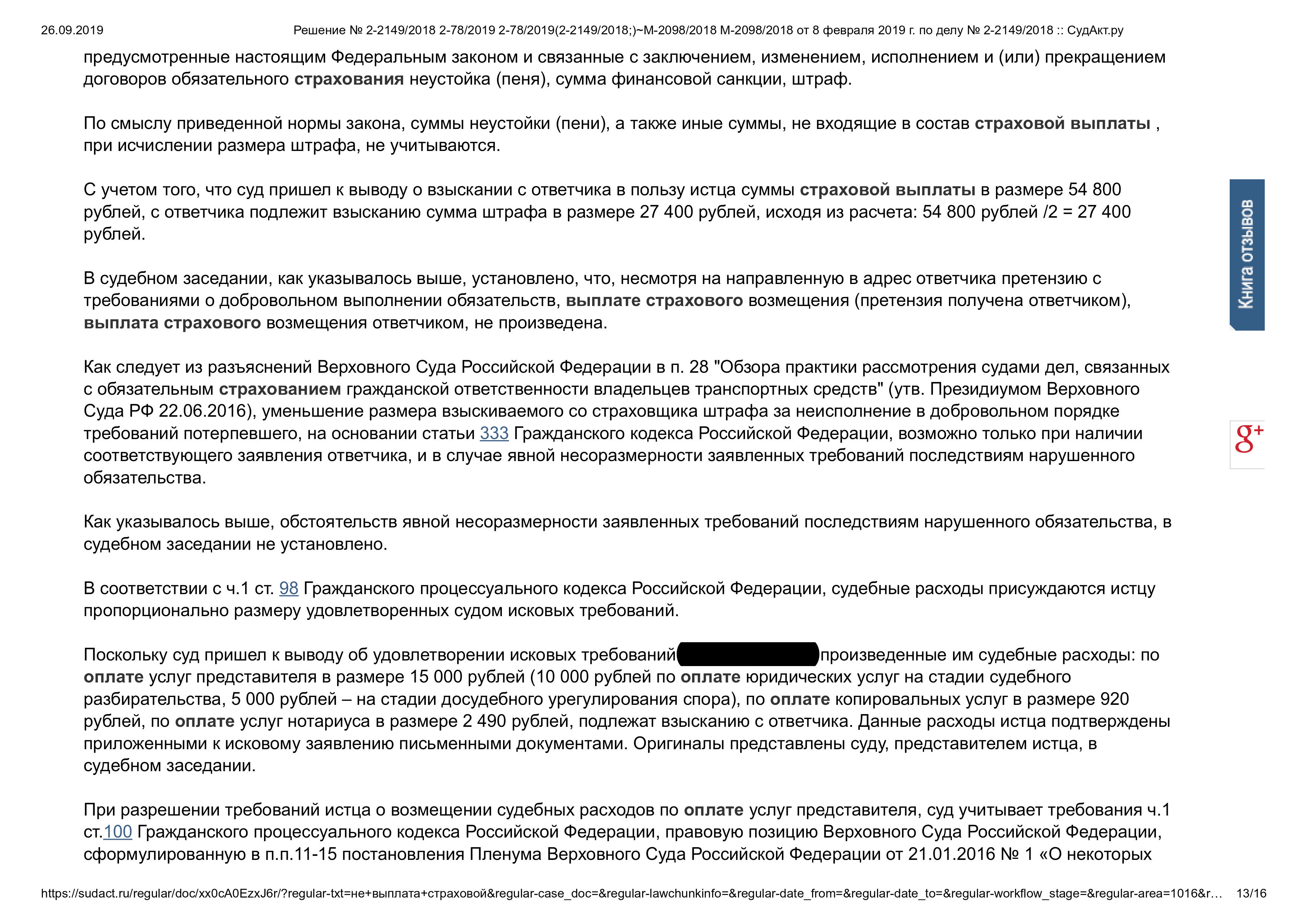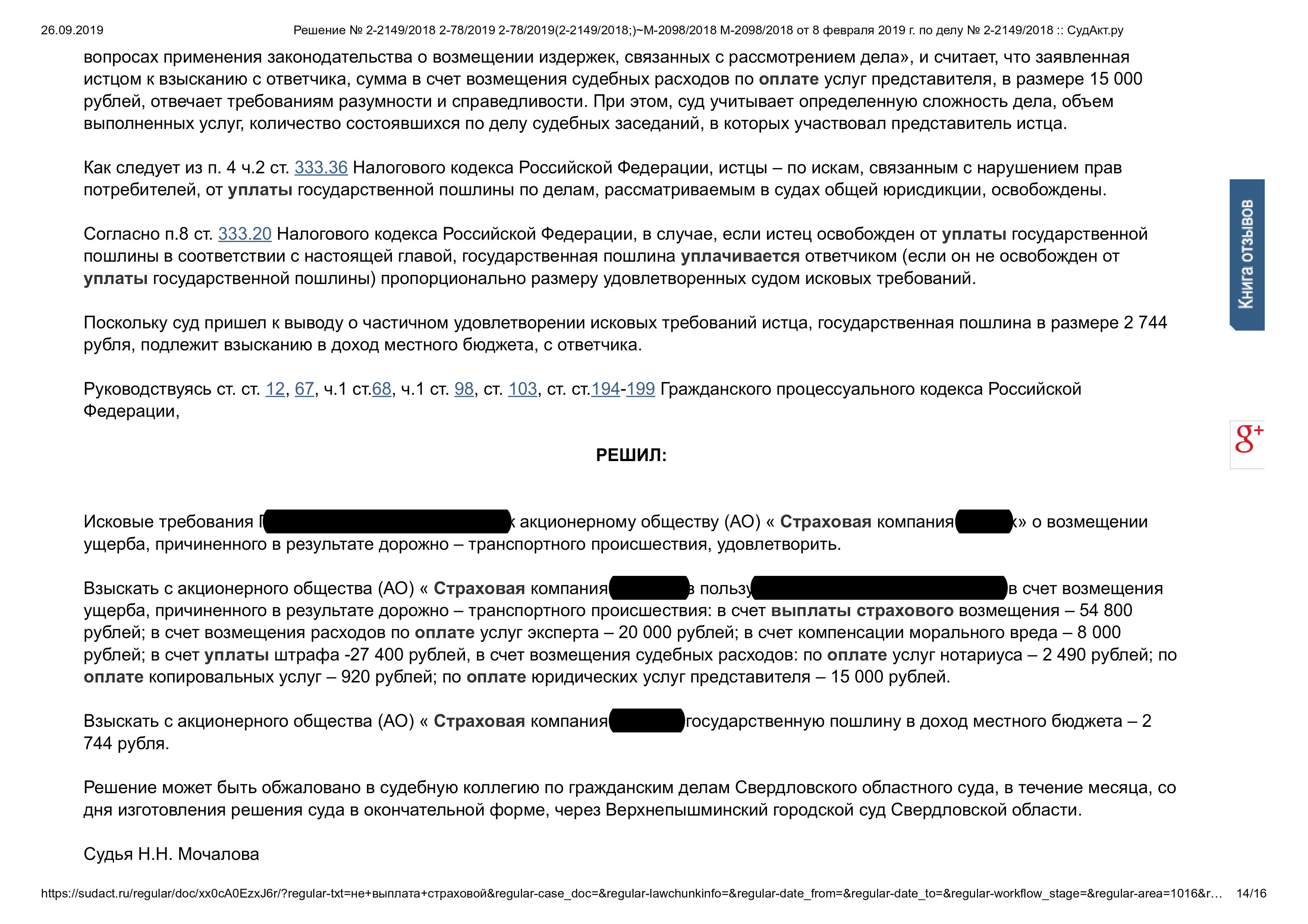 Суд решил: Взыскать с ответчика в пользу истца в счет возмещения ущерба, причиненного в результате дорожно – транспортного происшествия: в счет выплаты страхового возмещения – 54 800 рублей; в счет возмещения расходов по оплате услуг эксперта – 20 000 рублей; в счет компенсации морального вреда – 8 000 рублей; в счет уплаты штрафа ответчика – 27 400 рублей, в счет возмещения судебных расходов: по оплате услуг нотариуса – 2 490 рублей; по оплате копировальных услуг – 920 рублей; по оплате юридических услуг представителя – 15 000 рублей. Взыскать с ответчика государственную пошлину в доход местного бюджета – 2 744 рубля.