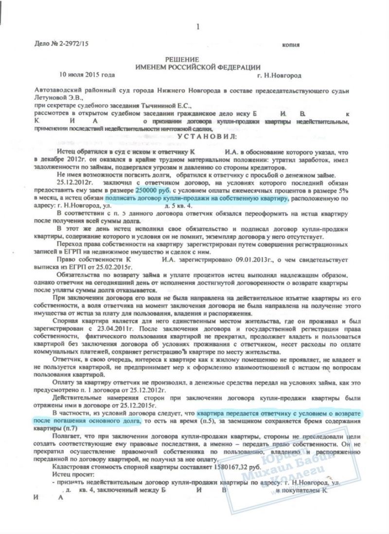 Наш клиент Б. попал в затруднительную ситуацию, связанную с просрочкой кредитов, и, находясь под давлением коллекторов, пошёл на опасную сделку. Он взял новый займ в 250.000 руб. на погашение кредитов, и оформил на представителя микрофинансовой организации свою квартиру. Предполагалось, что после выплаты долга и процентов, квартира будет ему возвращена. Однако, новый владелец посчитал, что вправе оставить жильё себе.