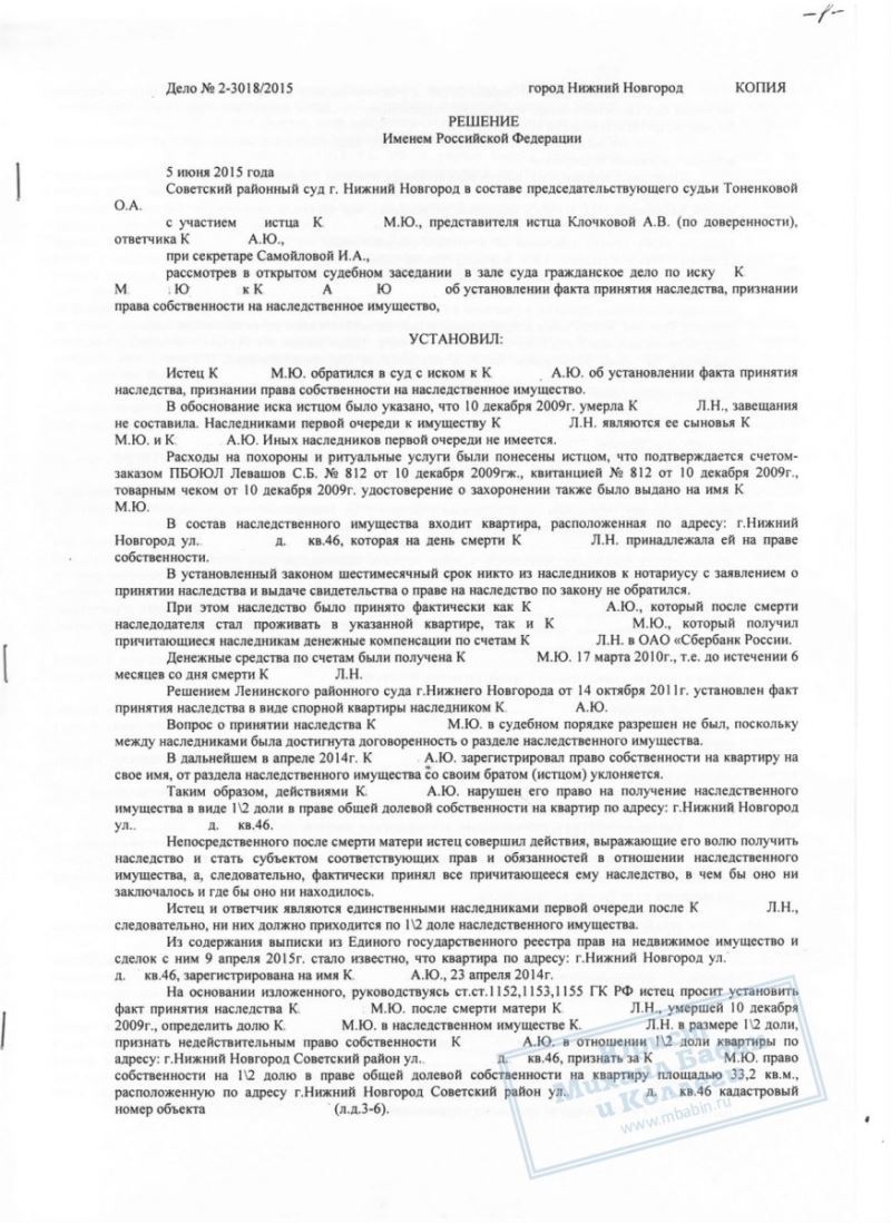 В 2015 году к адвокату по наследственным делам обратился К. со сложным спором. Его брат, пользуясь доверчивостью К., оформил квартиру, принадлежавшую матери исключительно на своё имя. Ситуация осложнялась тем, что К. при этом выразил в суде СВОЁ СОГЛАСИЕ на оформление квартиры на брата, т.к. между ним имелась устная договорённость о последующем распределении наследства. Однако брат К. предпочел воспользоваться наследством единолично, не делясь с родственником.