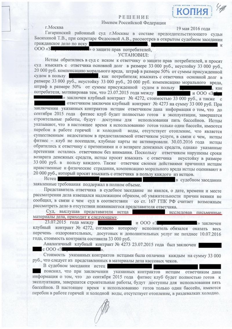 Адвокат по защите прав потребителей обратился в суд с иском к фитнес-клубу, поскольку клиенты фитнес-клуба не могли его полноценно посещать, заниматься спортом было невозможно, из-за частого отсутствия горячей воды, не были построены бассейны, в раздевалках было холодно и т.д. По этим причинам желание посещать фитнес-клуб отпало, однако, оплаченные денежные средства руководство фитнес-клуба добровольно клиентам возвращать отказалось.