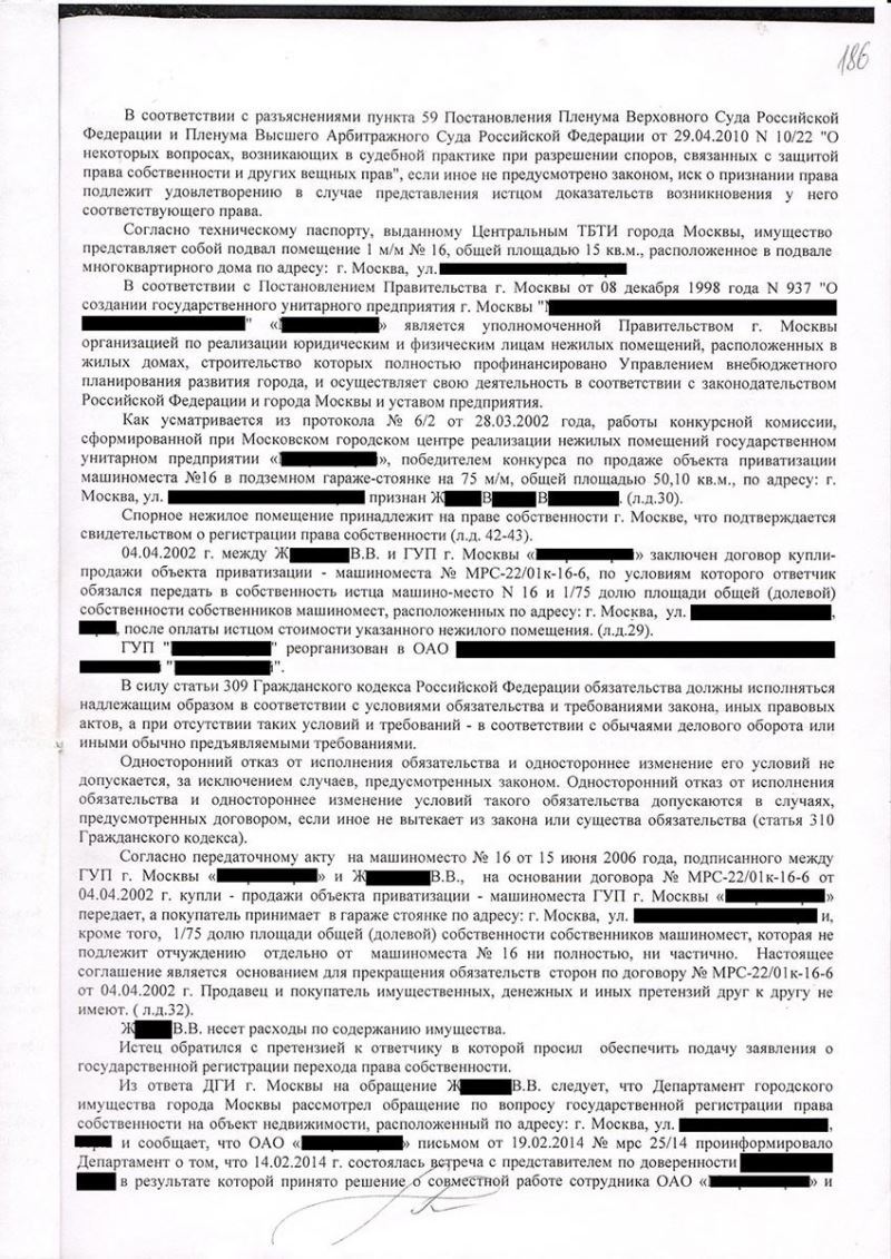 Адвокат ознакомился представленными клиентом материалами и выяснил, что причиной отказов Росреестра в регистрации права явилось недобросовестное действие продавца, который объединил все машиноместа на парковке и поставил их на учет как единый объект в качестве своей собственности. В связи с этим, даже при наличии всех документов, Росреестр отказывал в регистрации права собственности, поскольку машиноместо клиента не было учтено в Государственном кадастре недвижимости в качестве отдельного объекта, а продавец отказывался его выделять. Адвокат Алексей Краснов подготовил исковое заявление и обратился в Пресненский районный суд г. Москвы с требованием о признании за клиентом права собственности.