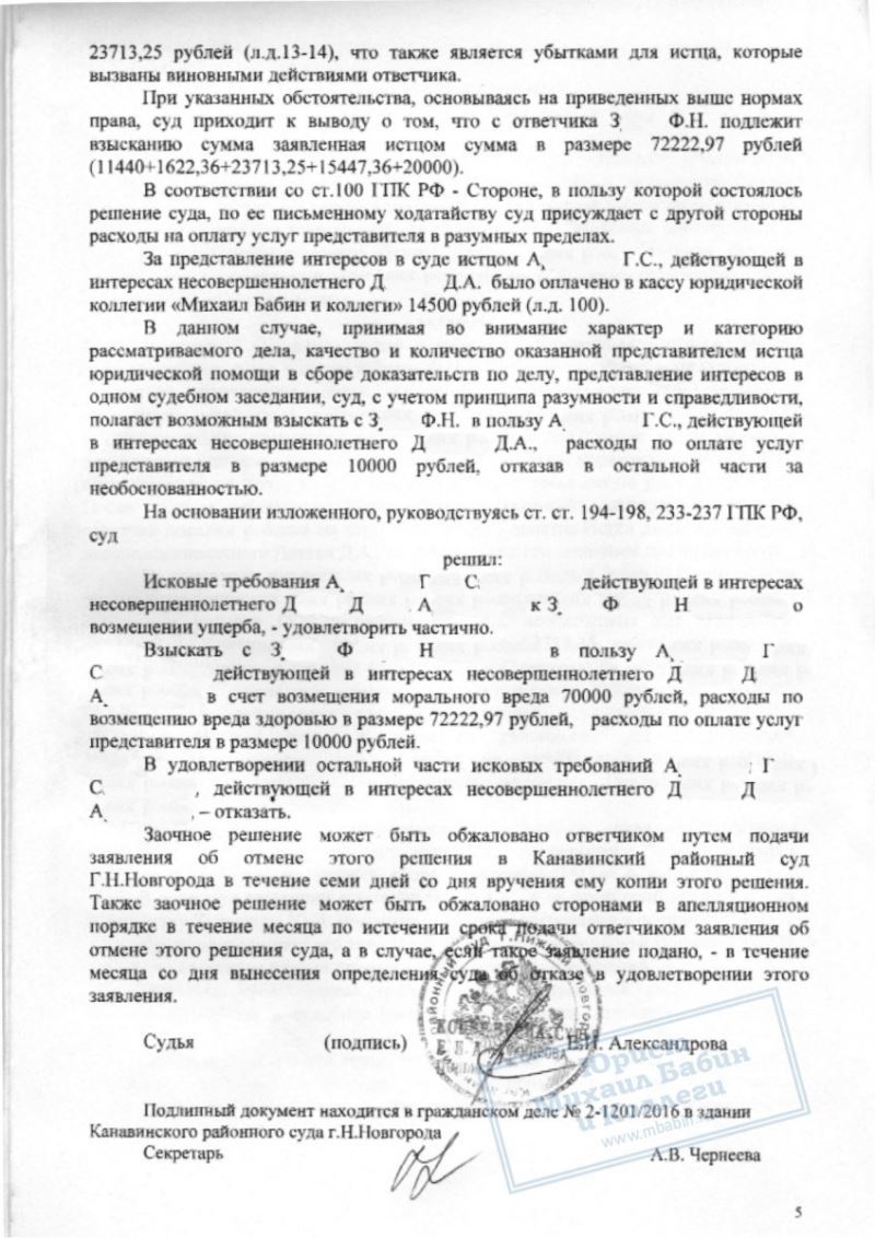 • с тренера в пользу несовершеннолетнего Д. взыскано 72 000 рублей на оплату лечения, 70 000 рублей — компенсация морального вреда, а также расходы на оплату услуг представителя, итого более 150 000 рублей.