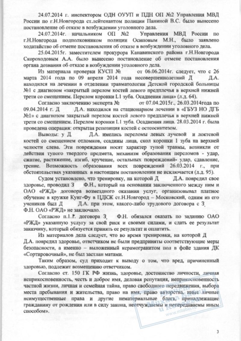 После получения травмы ребёнком его мать обратилась к нам. Мы подали исковое заявление в суд. В ходе разбирательства была назначена и проведена судебно-медицинская экспертиза, которая установила, что здоровью несовершеннолетнего Д. причинён вред средней степени тяжести. В судебных заседаниях мы представили доказательства того, что покрытие на полу в зале не было травмобезопасным, а тренер, заметив состояние мальчика, не остановил занятие, не оказал медицинскую помощь и не вызвал родителей. Суд признал тренера виновным в происшествии.