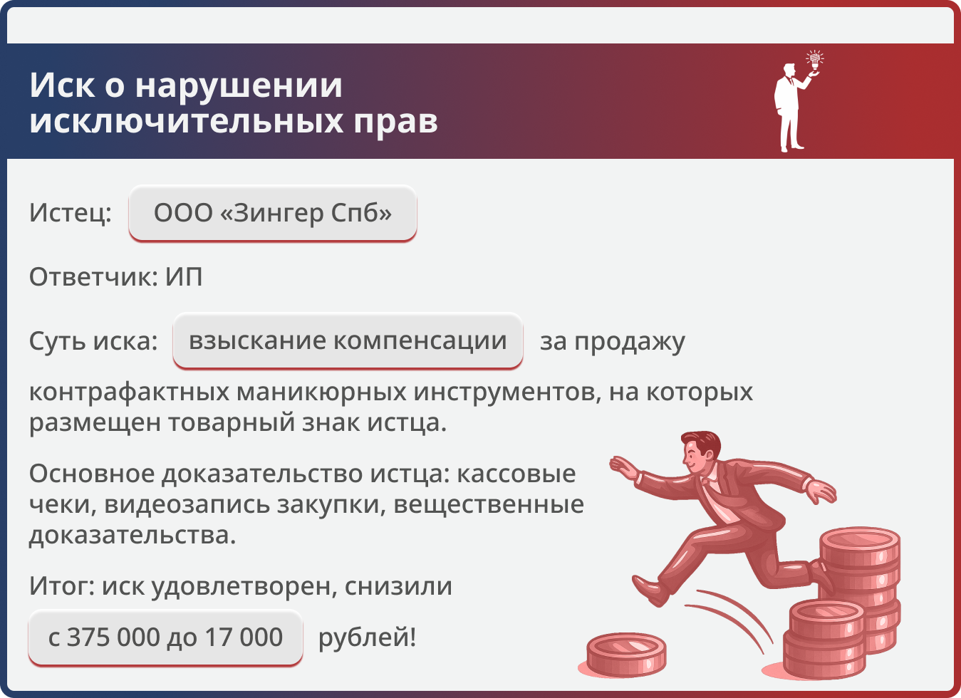 Истец требовал компенсацию за продажу двух маникюрных инструментов, основывая свой расчет на лицензионном договоре, заключенном после даты нарушения. Юристам «Оригинального решения» удалось доказать, что данный договор не может быть применен к рассматриваемому случаю, а также объединить две покупки в одно нарушение, что привело к более чем 20-кратному снижению размера компенсации.
