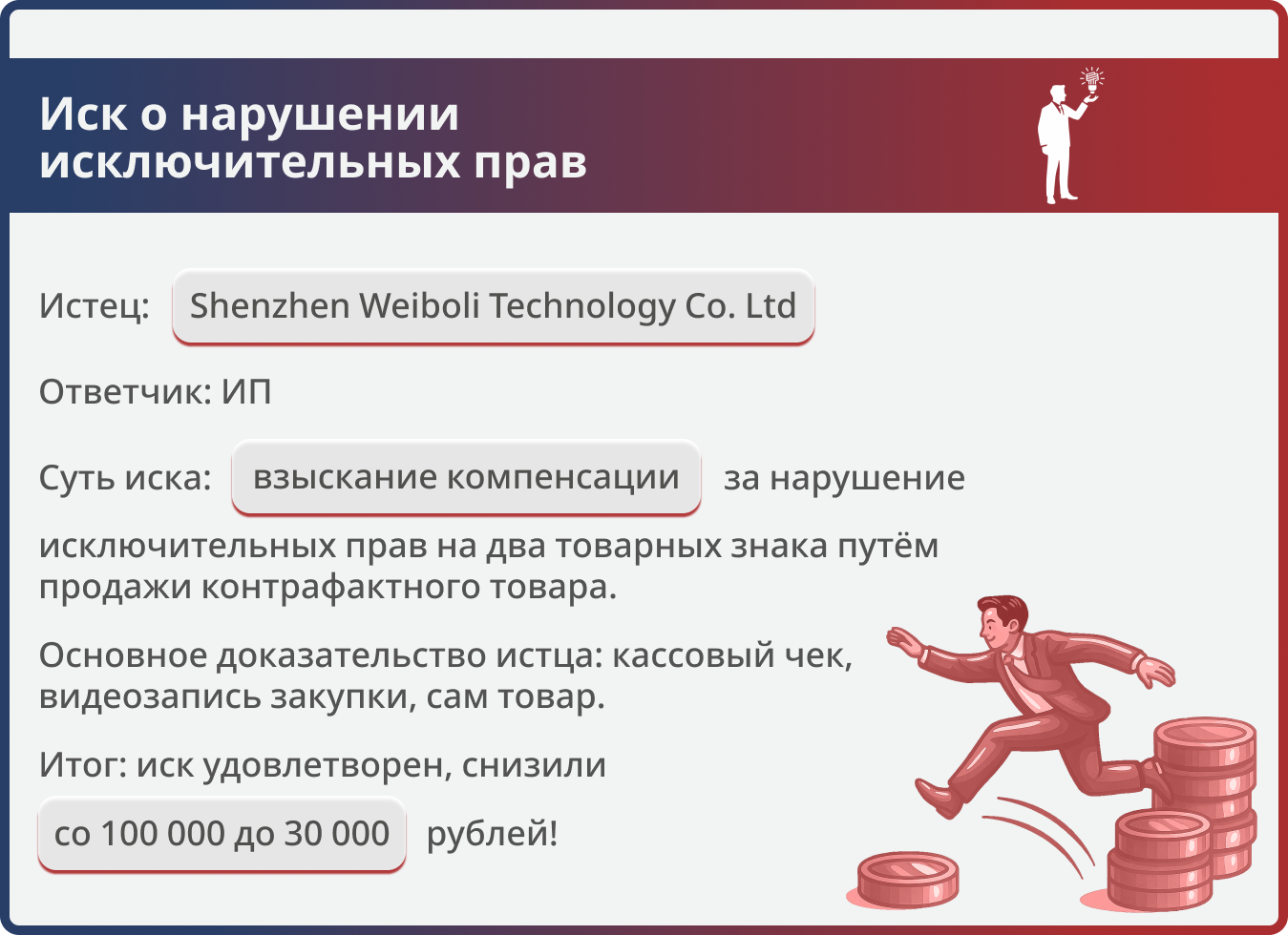 Истец (Shenzhen Weiboli Technology Co. Ltd) обратился в Арбитражный суд Московской области с иском к ИП о взыскании 100 000 руб. компенсации за нарушение исключительных прав на два товарных знака (по 50 000 руб. за каждый). Основание — продажа контрафактного товара, подтверждённая чеком, видеозаписью и вещественными доказательствами. Дело рассмотрено в порядке упрощённого производства.