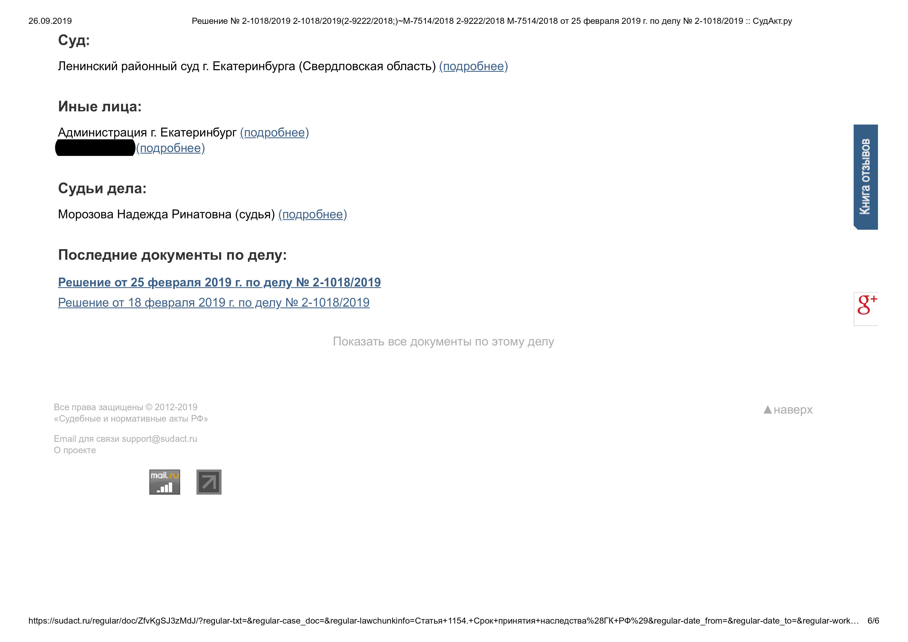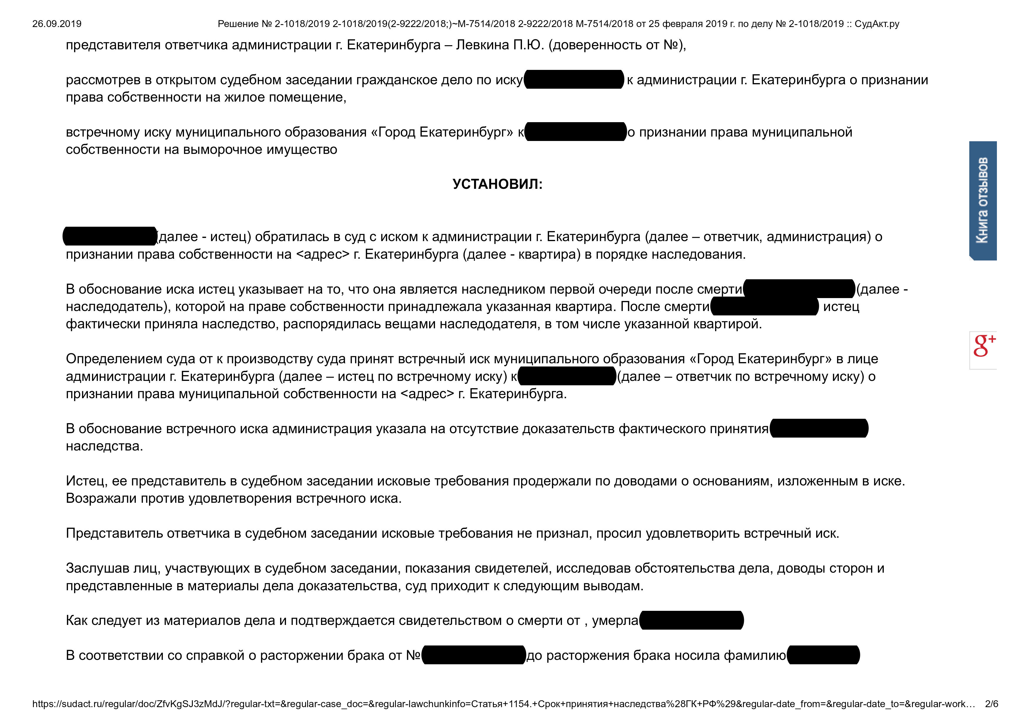Суд решил: Признать за нашей клиенткой право собственности на жилое помещение в порядке наследования. В удовлетворении встречного иска муниципального образования «Город Екатеринбург» отказать в полном объеме.
