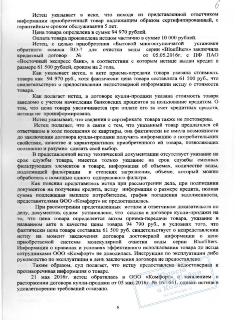 Предложение проверки качества водопроводной воды показалось М.М. полезным мероприятием. Однако, после демонстрации серии лабораторных опытов М.М. оказалась владелицей "Бытовой многоступенчатой установки обратного осмоса для очистки воды "Bluefilters" и кредита на 94 000 руб., сроком на 2 года. Взвесив реальные выгоды спонтанной покупки, М.М. поняла, что это была ее ошибка и попыталась вернуть товар организации. Но ей было отказано.